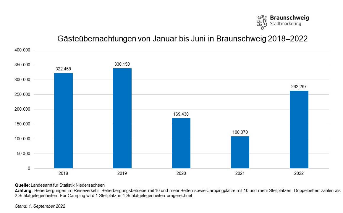 91.880 Gästeankünfte und rund 168.700 Übernachtungen hat das Landesamt für Statistik Niedersachsen (LSN) für das zweite Quartal in Braunschweig erfasst. Das bedeutet eine Steigerung der Ankünfte um circa 150 Prozent und der Übernachtungen um rund 160 Prozent im Vergleich zum Vorjahreszeitraum. Damit konnte das erste Halbjahr etwa 150 Prozent mehr Ankünfte und etwa 140 Prozent mehr Übernachtungen im Vergleich zu 2021 verzeichnen.