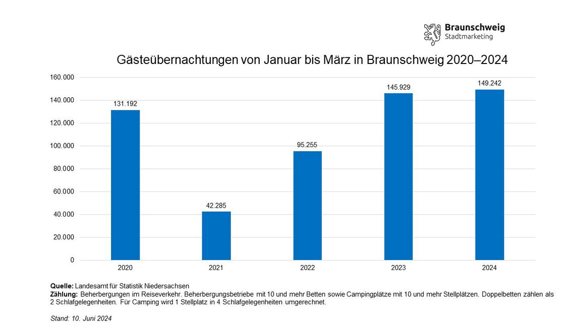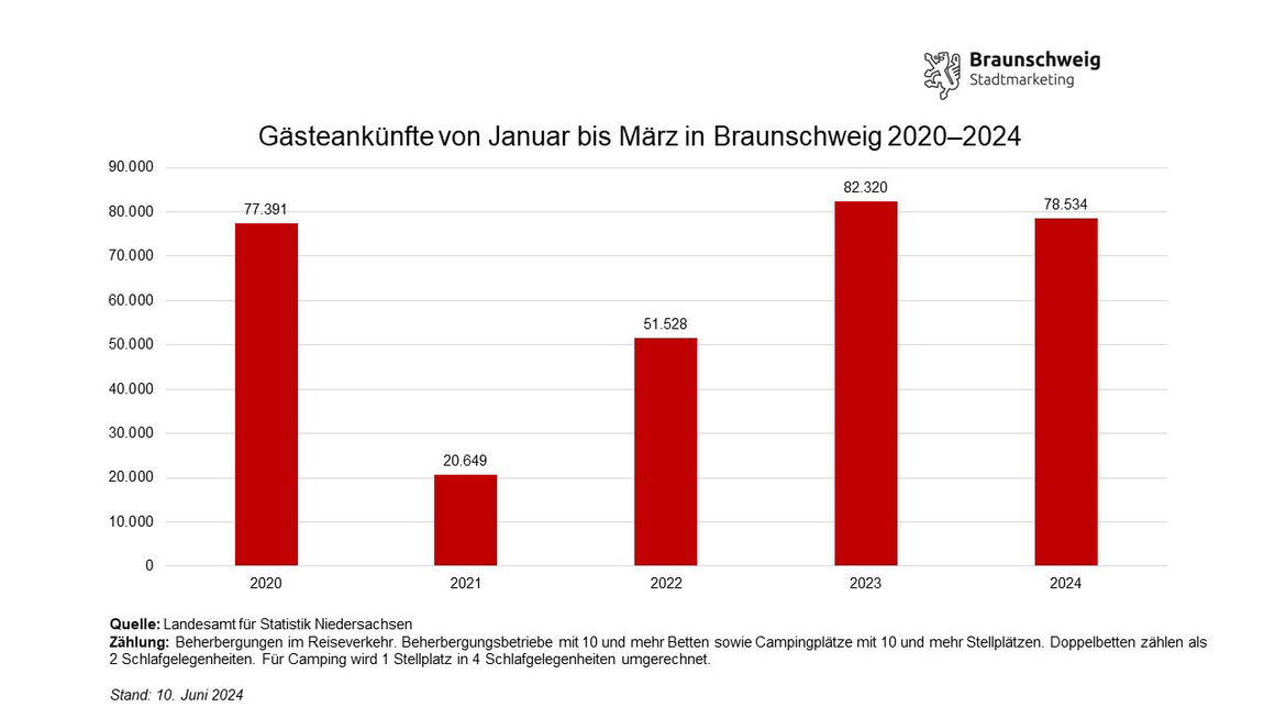 Rund 78.500 Gästeankünfte und 149.200 Übernachtungen hat das Landesamt für Statistik Niedersachsen (LSN) von Januar bis März 2024 in Braunschweig erfasst. Das bedeutet einen Rückgang der Ankünfte um rund fünf Prozent bei einer gleichzeitigen Steigerung der Übernachtungen um rund acht Prozent im Vergleich zum Vorjahreszeitraum.