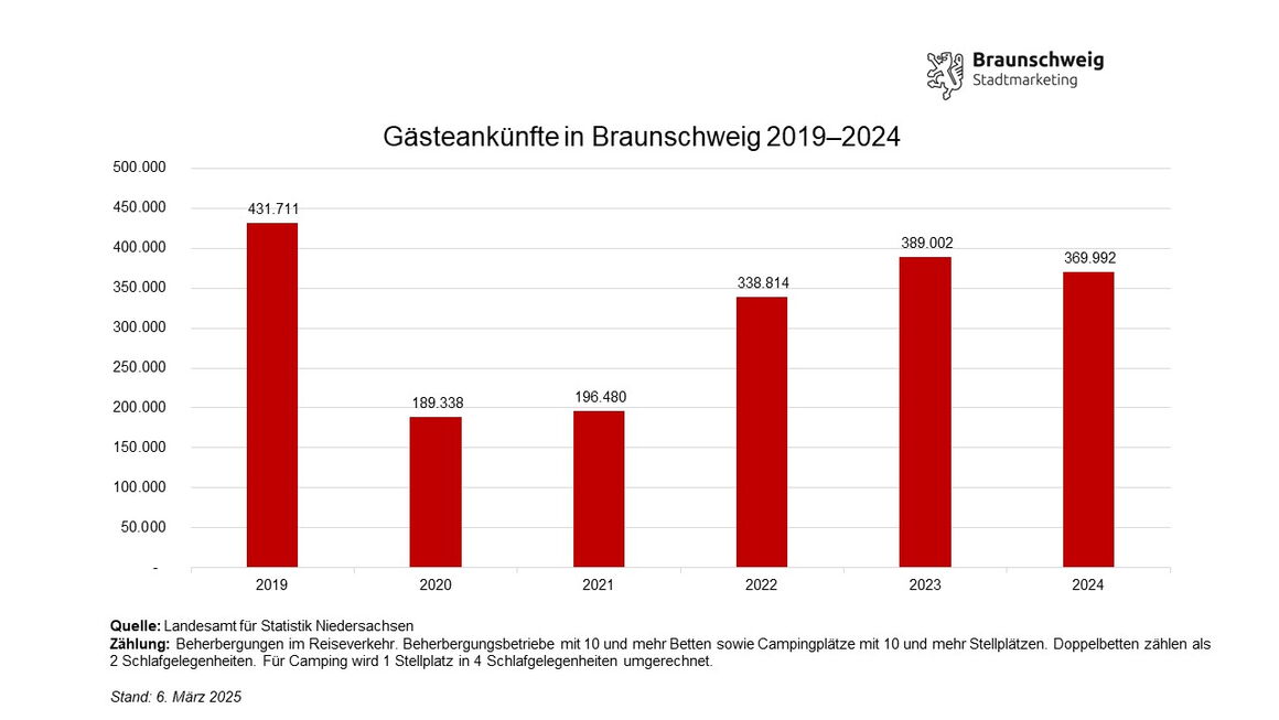 Das Tourismusjahr 2024 endet in Braunschweig mit einer positiven Nachricht: Das Landesamt für Statistik Niedersachsen (LSN) erfasste in der Löwenstadt im vergangenen Jahr über 713.000 Übernachtungen, was einer Steigerung um 1,5 Prozent im Vergleich zum Vorjahr entspricht. Die durchschnittliche Aufenthaltsdauer stieg gleichzeitig von 1,8 auf 1,9 Nächte. Damit liegen die Übernachtungszahlen erstmals wieder auf dem Niveau von vor der Pandemie.