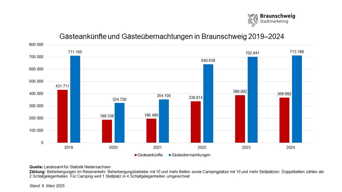 Das Tourismusjahr 2024 endet in Braunschweig mit einer positiven Nachricht: Das Landesamt für Statistik Niedersachsen (LSN) erfasste in der Löwenstadt im vergangenen Jahr über 713.000 Übernachtungen, was einer Steigerung um 1,5 Prozent im Vergleich zum Vorjahr entspricht. Die durchschnittliche Aufenthaltsdauer stieg gleichzeitig von 1,8 auf 1,9 Nächte. Damit liegen die Übernachtungszahlen erstmals wieder auf dem Niveau von vor der Pandemie.